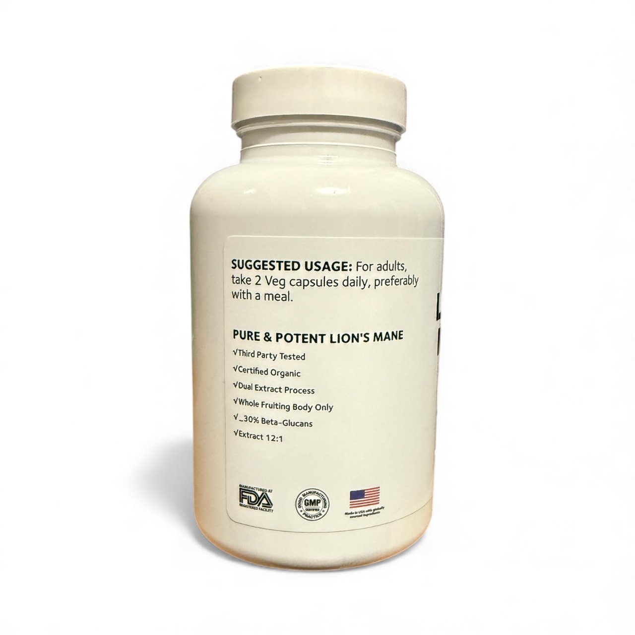 - Organic Lion’s Mane Extract (12:1, fruiting body) – 1,000 mg (equivalent to 12,000 mg mushroom powder, min. 30% beta-glucans)
